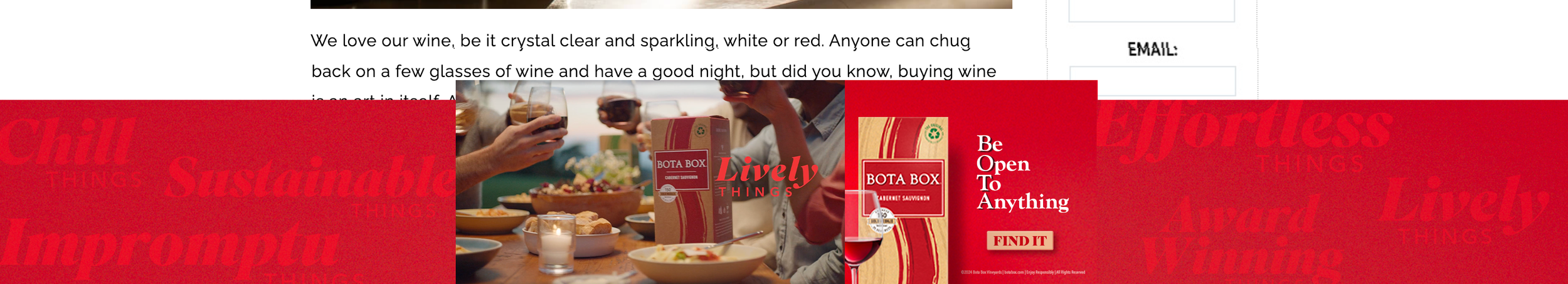Before becoming the name of the bestselling wine in the eco-friendly box, “bota” began as a 19th-century Spanish term for a wine container made of leather. To launch the brand’s first national campaign in years, we gave the word new meaning. Now BOTA stands for Be Open To Anything.